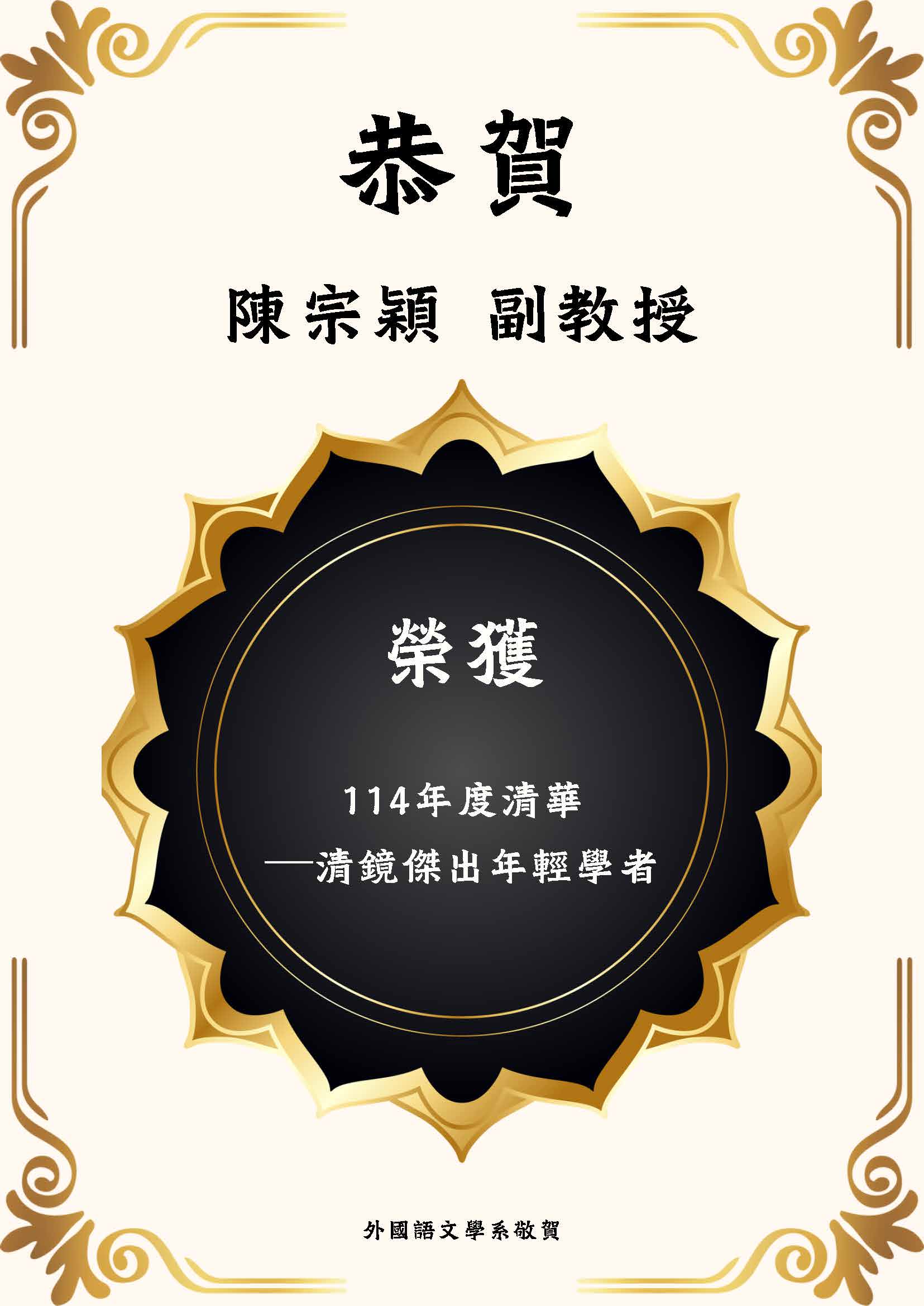 恭賀!本系陳宗穎副教授榮獲114年度清華-清鏡傑出年輕學者